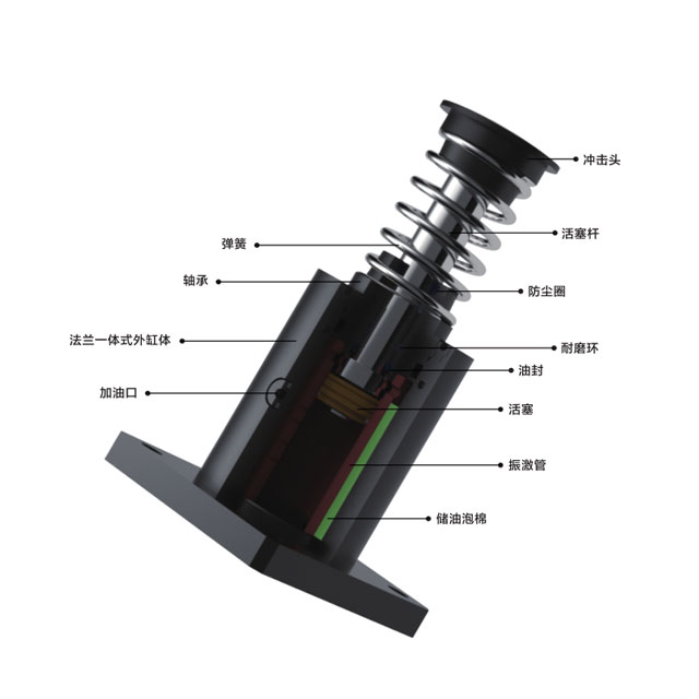| 緩沖時液壓油流過多節(jié)流孔產(chǎn)生粘滯阻尼力,將沖擊能量轉(zhuǎn)化為熱能;回程時,機械彈簧將活塞桿復位;在緩沖過程中,蓄能海綿被擠壓的體積與活塞桿進入內(nèi)缸體的體積一樣。 | ||||||||||||||||||||||||||||||||||||||||||||||||||||||||||||